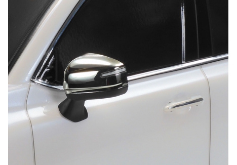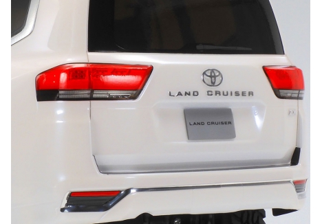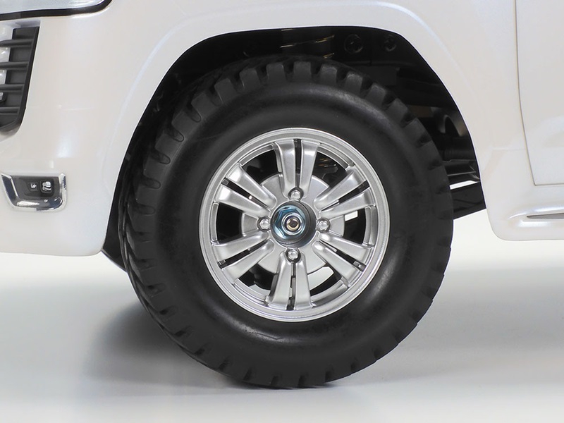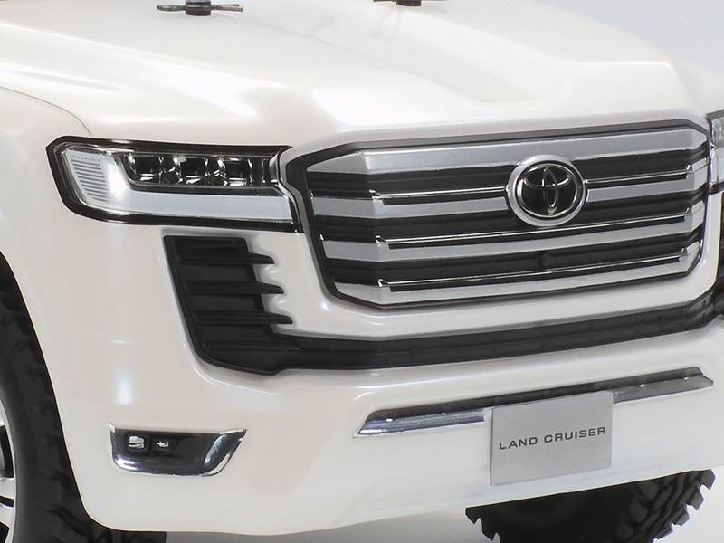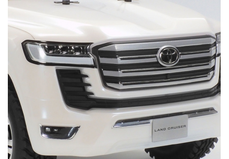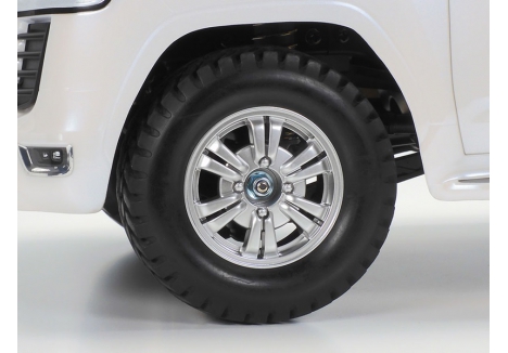 This R/C model assembly kit recreates the Land Cruiser 300 series announced in 2021. The polycarbonate body realistically depicts the eye-catching, dignified form with separate parts to capture the distinctive large front grille's horizontal fins and metal-plated sections. Light case and door mirror components are metal-plated, and door handles and shark fin antenna on roof are rendered by separate parts for more realism. Silver color 12-spoke wheels are paired with block pattern tires.