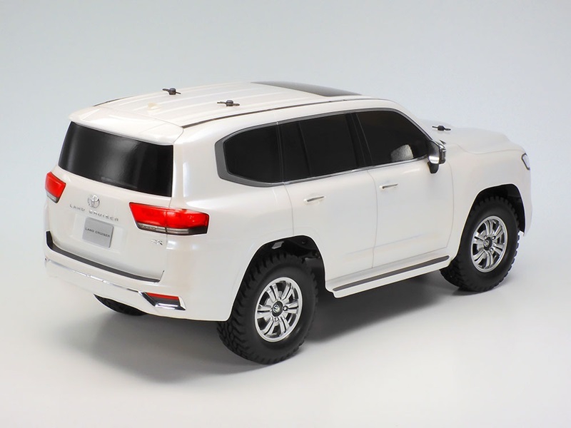The Tamiya polycarbonate body RC with ladder frame chassis stands out due to its attention to detail and structural integrity. The body replicates the Land Cruiser 300’s bold lines and proportions, with separate molded parts for key visual elements such as the front grille, bumper, side mirrors, and antenna. Metal-plated finishes add a premium touch, while stickers recreate the taillights and Toyota emblem. The ladder frame chassis not only supports the body with rigidity but also contributes to the model’s realistic stance and off-road capability. This combination of visual fidelity and mechanical strength makes the RC kit a compelling option for scale model enthusiasts.