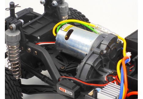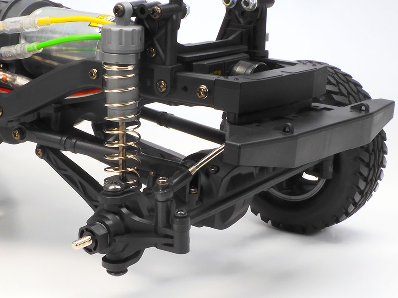 Explore the drivetrain and suspension technologies in the Tamiya 1/10 RC with CVA oil dampers and 4-link suspension