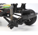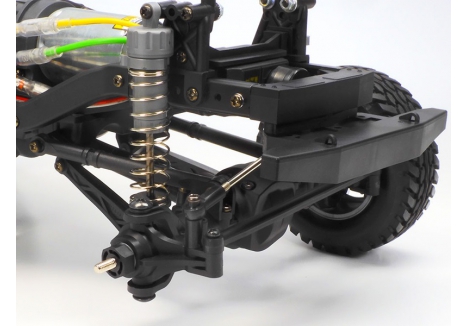 Designed for a wide range of off-road scenes including rocky terrain, the CC-02 chassis' ladder frame is inspired by full-size vehicles and is the base for its superior durability. A 4WD setup employs the motor longitudinally behind the front axle with separated gearbox and transfer case, and propeller shafts transmitting power to the differential gears front and rear. Four-link rigid suspension is employed front and rear, with CVA oil dampers for all-encompassing control, even on tricky rock sections. This model comes with 12-spoke wheels and semi-pneumatic rubber tires.