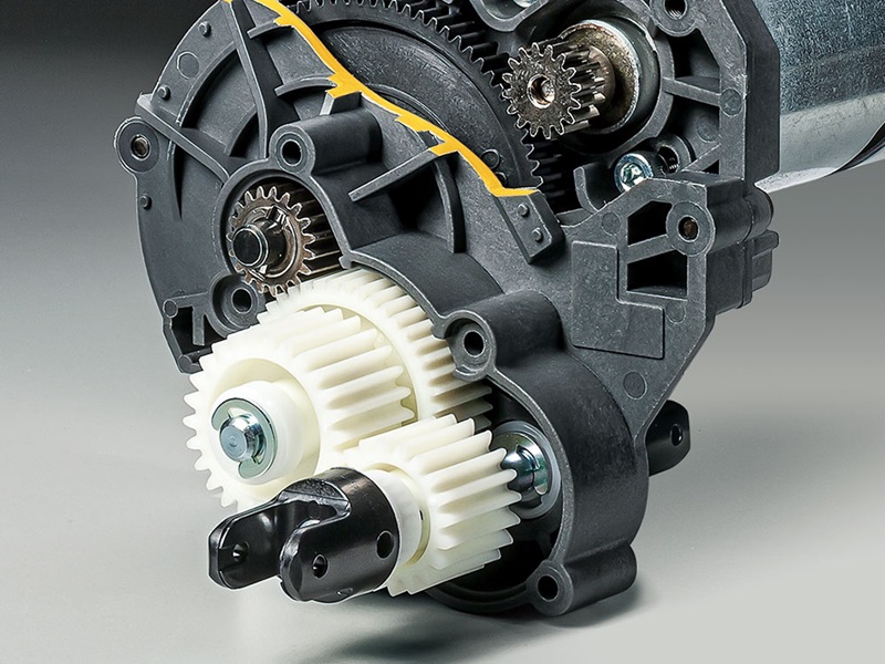 The Tamiya shaft-driven 4WD kit with block pattern tyres is purpose-built for trail enthusiasts. The tyres feature a rugged tread design that grips loose surfaces such as gravel, dirt, and rock. Combined with the shaft-driven drivetrain, which ensures consistent power delivery to all four wheels, the RC car maintains traction and control in challenging environments. The differential gears housed within reinforced plastic axle housings can be locked during reassembly, giving users the option to enhance climbing ability and traction when needed. This adaptability makes the kit a reliable choice for trail driving and outdoor exploration.