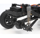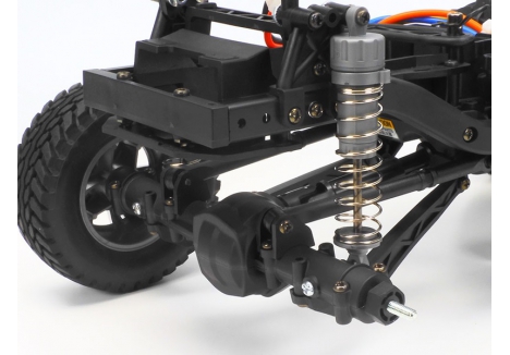 The Tamiya 1/10 RC with CVA oil dampers and 4-link suspension integrates advanced mechanical systems for superior off-road handling. The drivetrain features a longitudinal motor layout, with power routed through a gearbox and transfer case to both axles. This setup ensures efficient torque distribution and minimizes drivetrain stress. The suspension system uses a 4-link rigid configuration at both the front and rear, paired with CVA oil dampers that provide responsive shock absorption. These technologies work together to maintain wheel contact and stability, allowing the RC car to traverse uneven terrain with confidence and control.