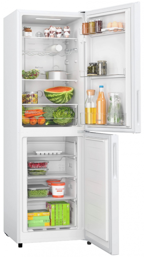 The Bosch KGN27NWEAG fridge freezer is a sleek and practical solution for households seeking reliable cooling in a compact format. With a balanced 50/50 split and a clean white finish, this Bosch 55cm white fridge freezer fits seamlessly into modern kitchens, utility rooms, or smaller living spaces. Its Total No Frost system, MultiBox drawer, and LED lighting make everyday food storage simple, efficient, and hassle-free.