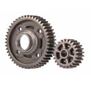 The overdrive gear set for X-Maxx® and XRT® replaces the standard transmission gears with a 24-tooth input gear and 47-tooth output gear. The overdrive gear set increases the upper range of gearing options beyond standard high-speed gears for aftermarket low kV motors. This gear set makes a significant change to the final drive ratio, effectively adding 5-6 teeth to the pinion gear.