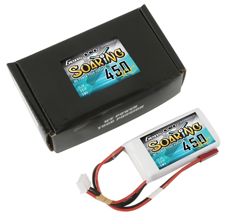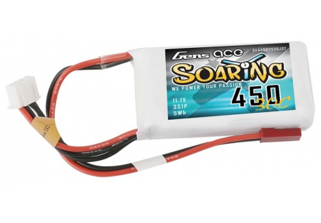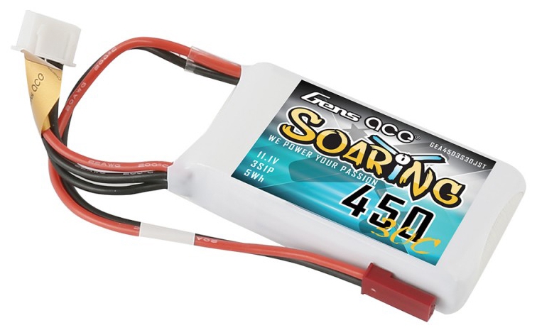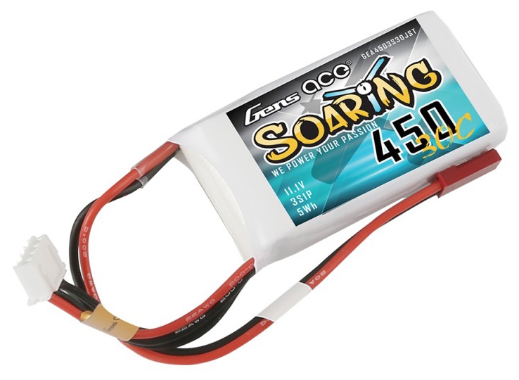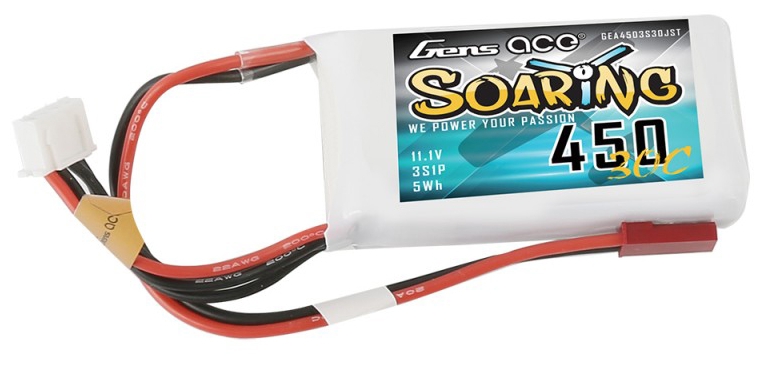 Gens ace soaring lipo 450mah 3S1P 30C battery is suitable for the following models: small indoor 3D, aerobatic, sport, or scale airplanes using Park 300 and Park 370 motors on 3S applications.