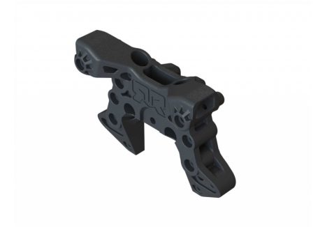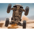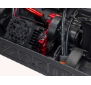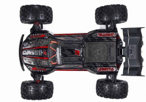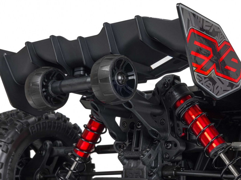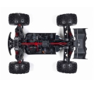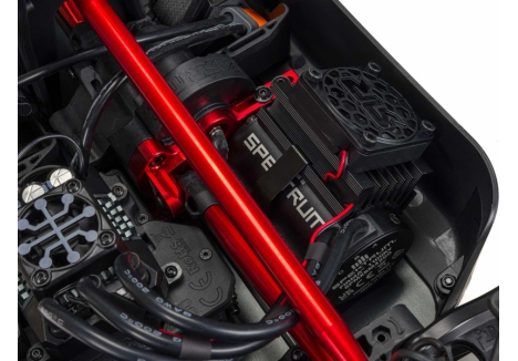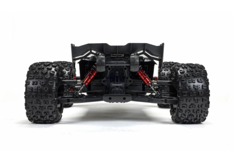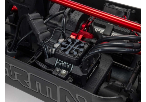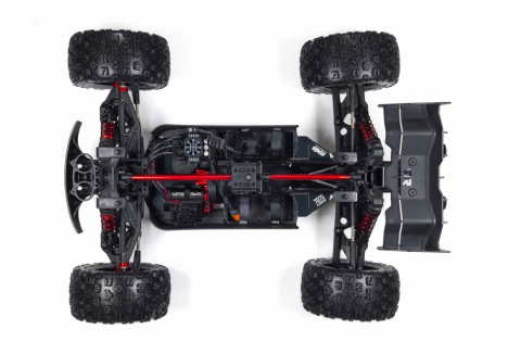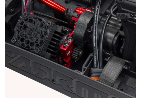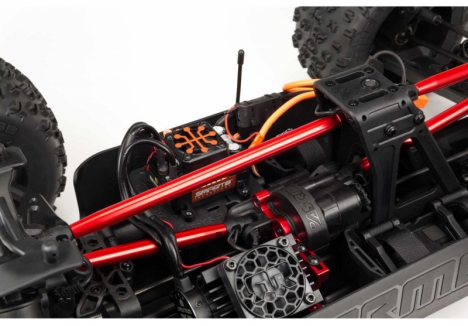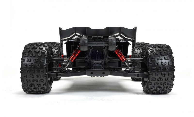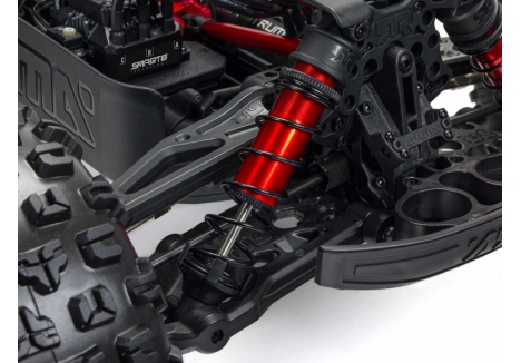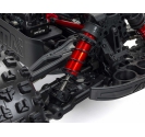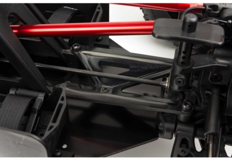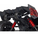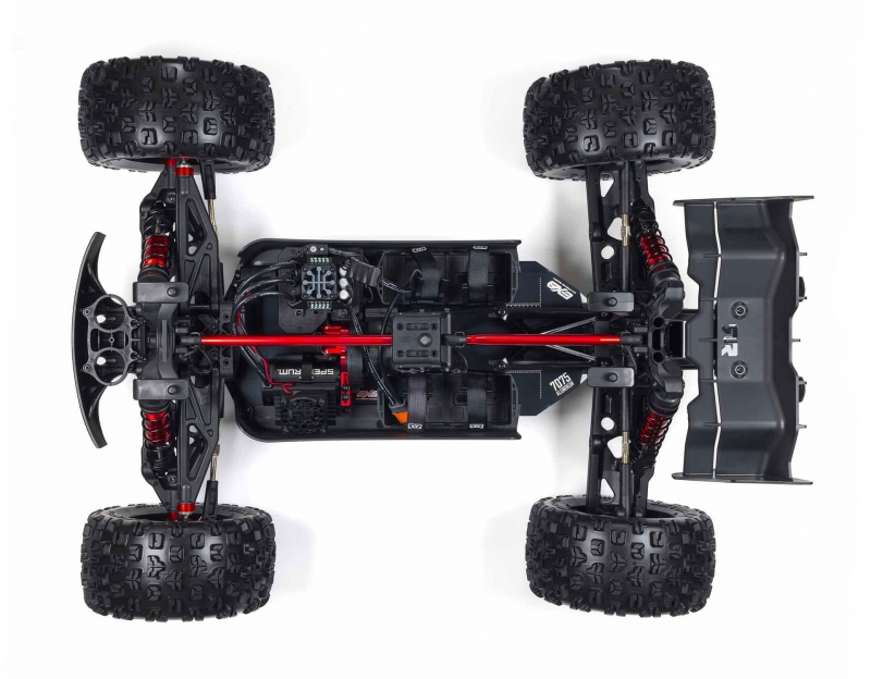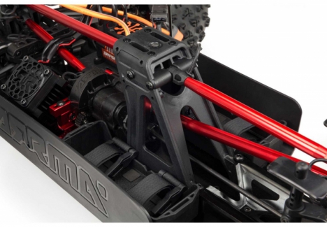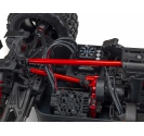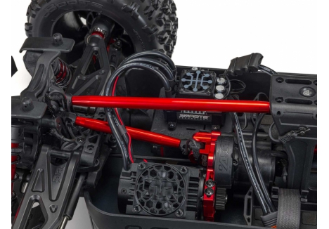 The ARRMA KRATON brushless truck with aluminium chassis and oil-filled shocks features a 5mm thick laser-etched EXB 7075-T6 aluminium plate that forms the backbone of its rugged structure. Reinforced with red-anodized CNC aluminium front brace mounts and composite side pods, the chassis resists flex and absorbs impact. A multi-structured center brace system adds rigidity, while the center body support prevents shell deformation during hard landings. This chassis layout ensures the KRATON remains stable and responsive, even under extreme bashing conditions.