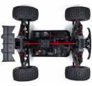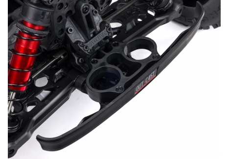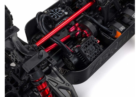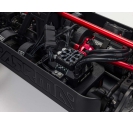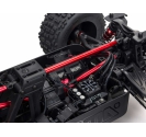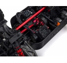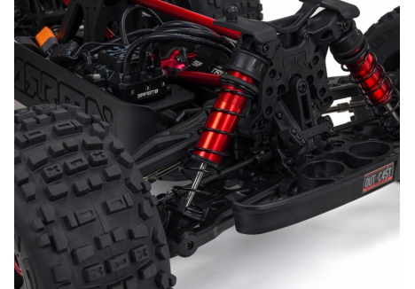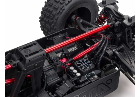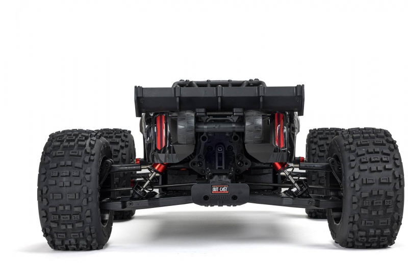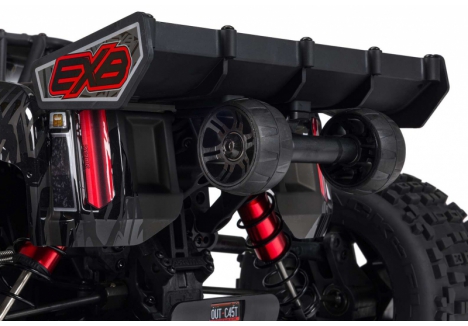 The ARRMA OUTCAST brushless truck with aluminium chassis and oil-filled shocks features a 5mm thick EXB 7075-T6 aluminium plate that forms the structural backbone of the truck. Reinforced with red-anodized CNC aluminium front brace mounts and composite chassis side pods, the chassis resists flex and absorbs impact during extreme landings. A center body support and multi-structured brace system add rigidity, while the modular design allows quick access to key components. This rugged foundation ensures the ARRMA OUTCAST EXB remains stable and responsive, even during high-impact stunts and off-road bashing.