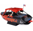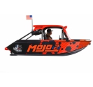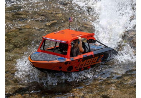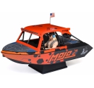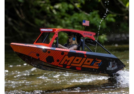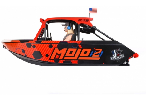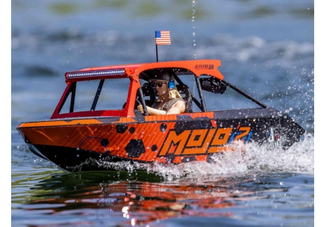 The Pro Boat Jetstream RC Jet Boat is a black, 24-inch, 1/6 scale powerhouse built for RC enthusiasts who demand performance, realism, and rugged durability. Designed to dominate shallow water environments and engineered for aggressive bashing, this Mojo-liveried jet boat brings full-size jet boating thrills to the remote-controlled world. With no propeller or rudder, the Jetstream uses a high-performance jet propulsion system to navigate water as shallow as 2 inches, making it ideal for ponds, streams, and whitewater conditions. Whether you're launching off wakes or carving through narrow channels, this Ready-To-Run model is built to outperform.