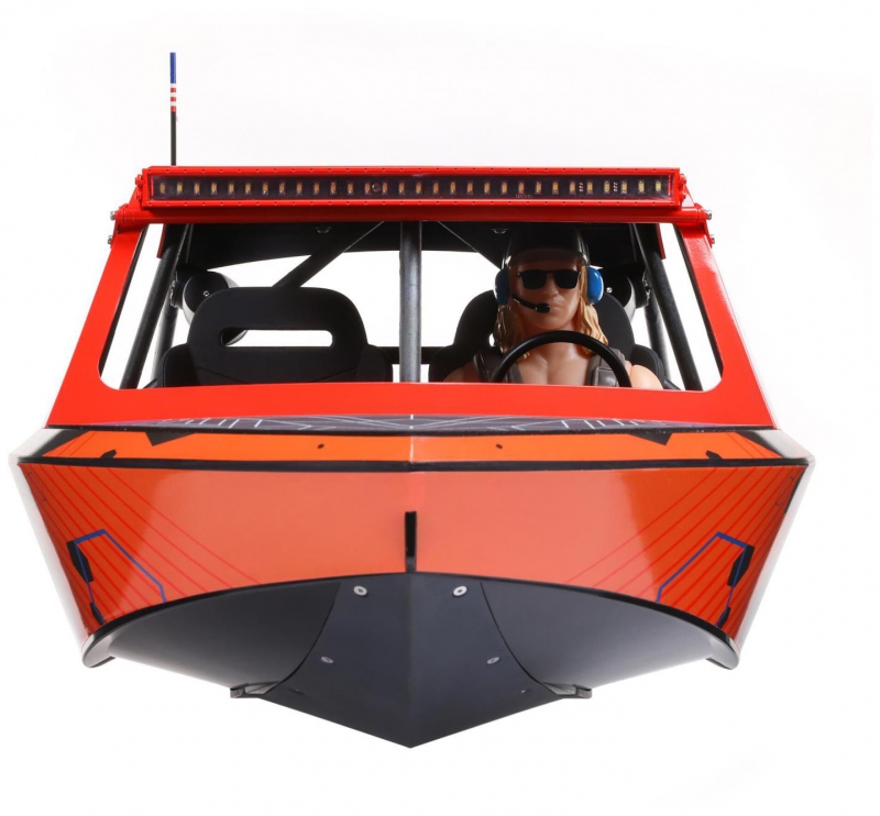 The Pro Boat RC boat with LED lights and poseable driver figure includes forward and rear-facing waterproof LED light bars that illuminate the boat during low-light conditions and add visual flair. The poseable driver figure, inspired by Blake Wilkey, can be positioned in casual or driving poses, enhancing the boat’s scale authenticity. Additional cockpit details such as the roll cage, steering wheel, deck material, and simulated speakers contribute to the immersive experience, making this RC jet boat a standout in both performance and presentation.
