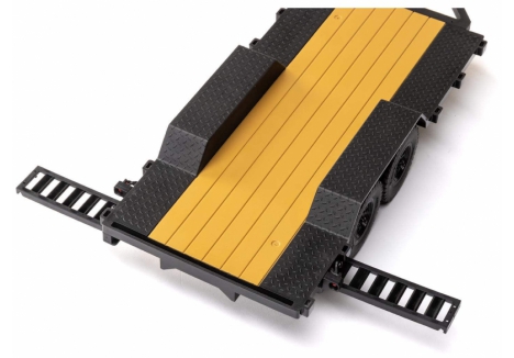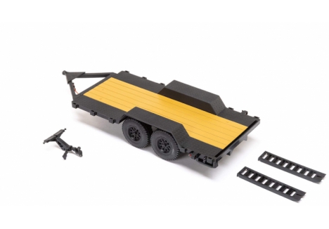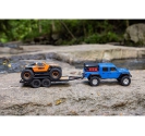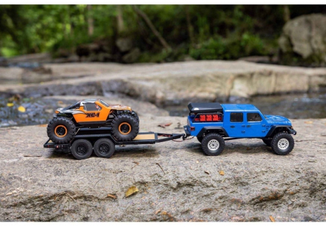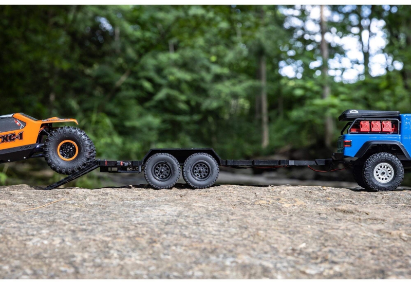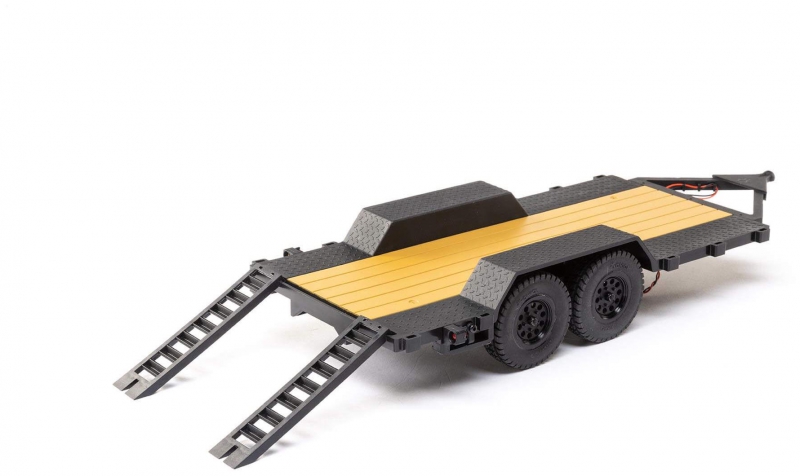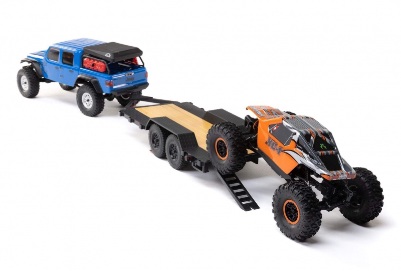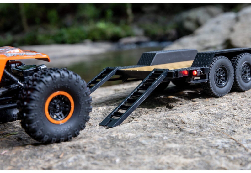 Hitch up the Axial SCX24 Flat Bed Vehicle Trailer to your SCX24 and tow that AX24 crawler to the trail! This is the ultimate functional accessory for 1/24 scale RC rigs - ready to use and complete with hitch, working LED lights, and hide-away ramps.