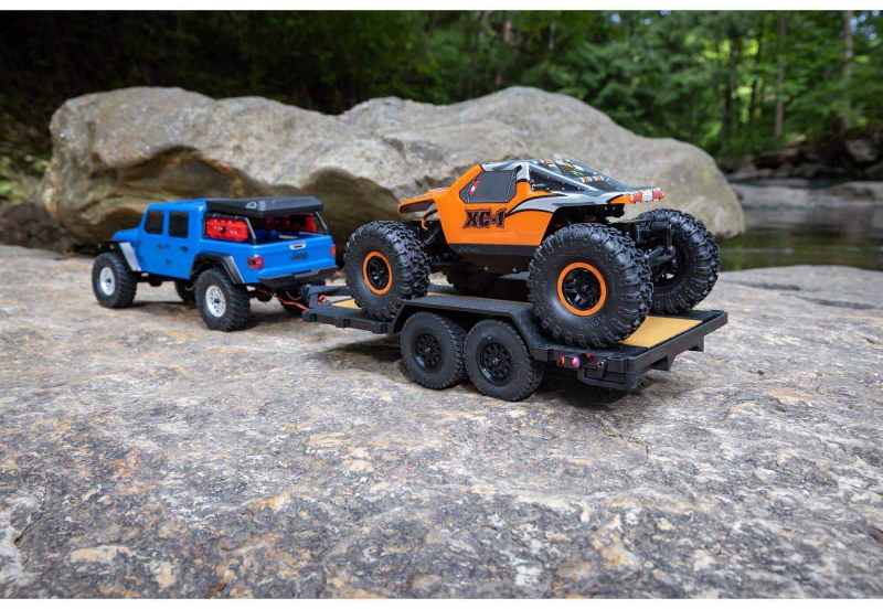 Inexpensive, fully assembled, and ready to use, the Axial SCX24 Flat Bed Vehicle Trailer is more than an exciting scale accessory for your 1/24 scale rig. When transporting your crawler while hitched behind your SCX24, it's an adventure on the move.