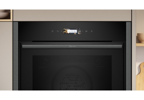 The 3.7-inch Full Touch TFT display on this neff b54cr71g0b slide and hide single oven provides clear, intuitive control of all functions. Effortlessly navigate menus, select modes, adjust temperatures, and set timers with a simple touch. This premium display perfectly complements the sleek graphite grey finish and modern handle design, ensuring this neff b54cr71g0b built in electric oven looks as good as it performs.