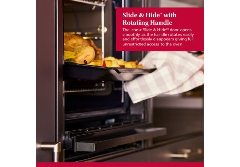The signature feature of this slide and hide built in electric oven is its unique fully retractable door. The Slide&Hide® mechanism allows the oven door to glide seamlessly under the cavity, giving you full, unrestricted access to your dishes. Perfect for basting roasts, turning trays or serving directly from the oven, the ergonomic design improves safety and convenience in any kitchen. The soft-close operation also adds a touch of quiet elegance to the user experience.