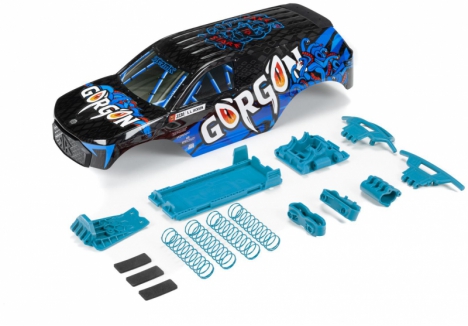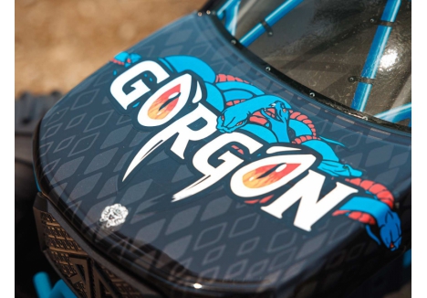 The ARRMA GORGON MEGA 550 blue truck with dBoots Chevron MT tires and composite chassis is designed to turn heads with its bold styling and coordinated trim. The pre-painted polycarbonate body features a striking blue finish complemented by matching shock springs, battery tray, skid plates, and bumpers. A quick-release mechanism allows users to access internal components in seconds, streamlining maintenance and battery changes. Hidden body mounting preserves the clean lines of the truck, enhancing its scale realism and visual appeal. These design elements make the truck as stylish as it is functional.