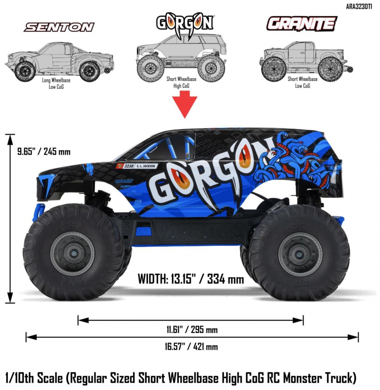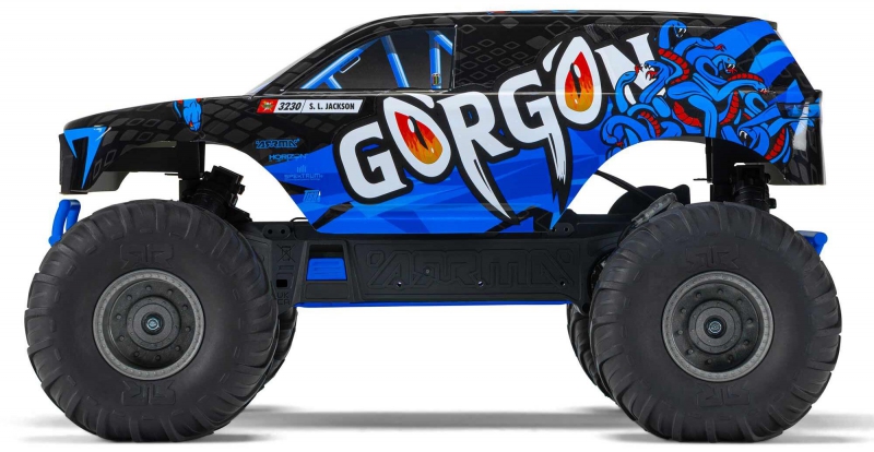 - Product Type: ARRMA C-ARA3230T1 GORGON MEGA 550 2WD monster truck blue, ARRMA C-ARA3230T1 1/10 scale brushed RC truck with SLT2 transmitter, ARRMA C-ARA3230T1 electric 2WD monster truck with MEGA 550 motor, ARRMA GORGON MEGA 550 blue truck with dBoots Chevron MT tires and composite chassis, C-ARA3230T1 monster truck with waterproof ESC, S660 servo, and bottom-loading battery tray, ARRMA GORGON 2WD RTR with oil-filled coilover shocks and brushless-ready drivetrain