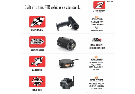 - Transmitter: Spektrum SLT2 2-channel 2.4GHz – Includes speed-limiting modes for beginner control