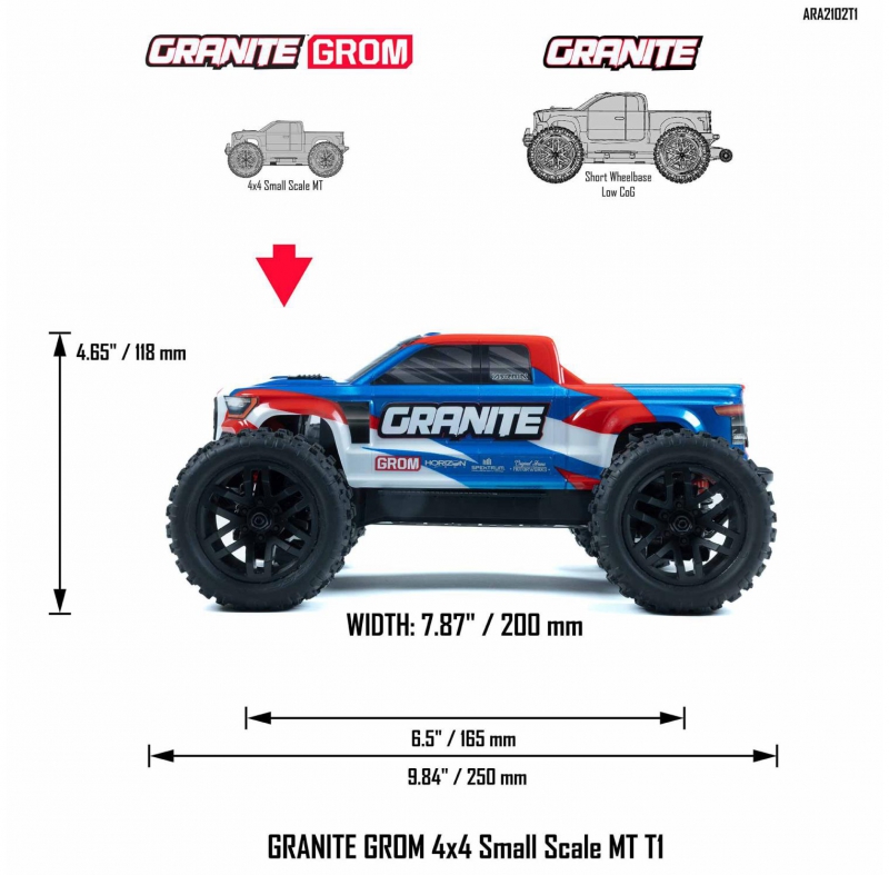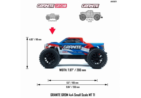 - Product Type: ARRMA GRANITE GROM C-ARA2102T1, ARRMA GRANITE GROM blue mini RC truck C-ARA2102T1 with battery, ARRMA GRANITE GROM C-ARA2102T1 small scale brushed monster truck blue RTR, ARRMA GRANITE GROM blue RTR with Spektrum SLT2 radio and IC2 battery, ARRMA GRANITE GROM blue monster truck with composite chassis and dBoots tires, ARRMA 1/18 blue monster truck with MEGA 380 motor and clipless body mount