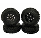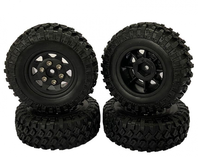 Super value wheel and tyre set for your 1/24th scale or SCX24 model. Great looking fake chrome wheel bolts sets off these strong nylon wheels. The soft block tread tyre gives plenty of grip when your putting your car through its paces.