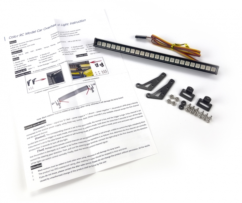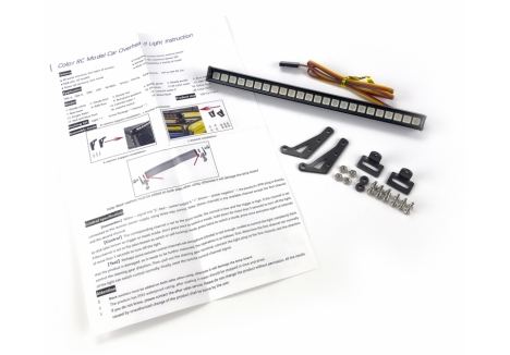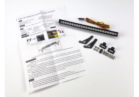 The kit includes a column support fixing and L-Bracket fixings allowing you to fit this bar in a number of positions on a bodyshell, off a bumper or even a roof rack! The light bar has a 15inch long cable that once connected to your auxiliary (or any other spare channel on the receiver with a switch/button assigned to it on the radio) you will be able to cycle through the 20 different light modes. There light modes range from a Steady bright white mode that can illuminate the darkest of trails, through to a colourful flashing mode that is certain to dazzle!