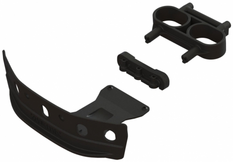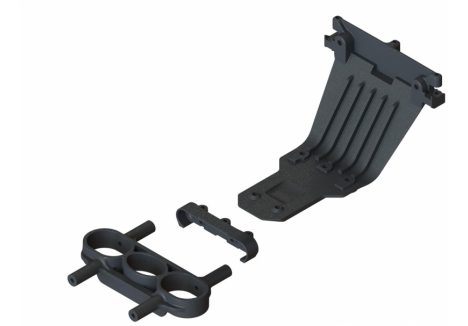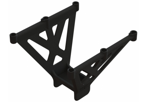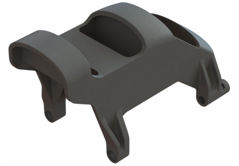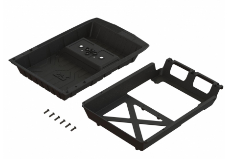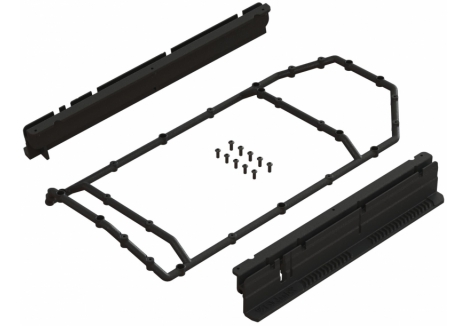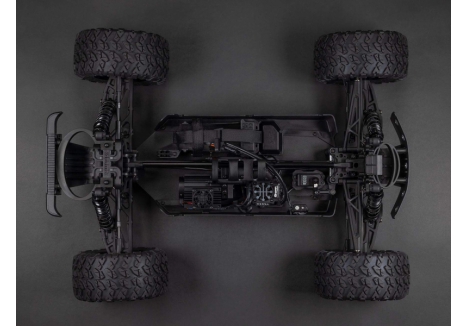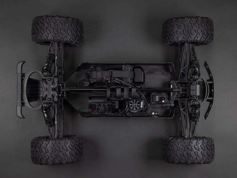 The ARRMA monster truck with aluminium chassis and clipless body mount features a 3mm thick 6061-T6 aluminium chassis that provides a rigid foundation for high-speed off-road driving. Reinforced with composite side pods, a center body brace, and black-anodized shock towers, the chassis resists flex and absorbs impacts during aggressive bashing. This structural integrity ensures consistent suspension geometry and drivetrain alignment, even under extreme loads. The stealth-black finish adds visual aggression while protecting against wear. Combined with the clipless body mount system, which allows quick access without compromising scale detail, the chassis design supports both performance and practicality.