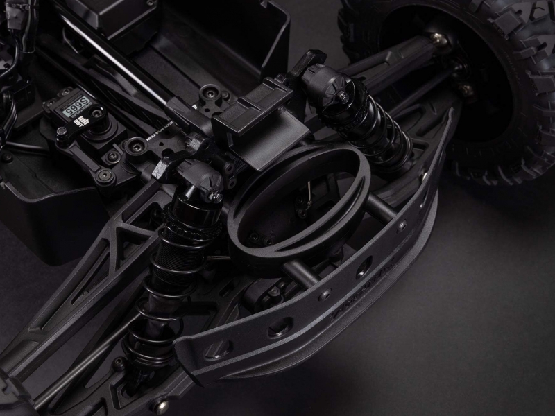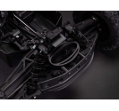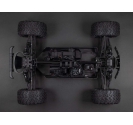 The ARRMA monster truck with aluminium chassis and clipless body mount features a 3mm thick black-anodized 6061-T6 aluminium plate reinforced with composite side guards and a center body brace. This chassis resists flex under load, maintaining suspension geometry and drivetrain alignment during aggressive bashing. The stealth-black finish adds visual aggression while protecting against wear. Combined with the clipless body mount system, which allows quick access without compromising scale detail, the chassis design supports both performance and practicality for serious off-road action.