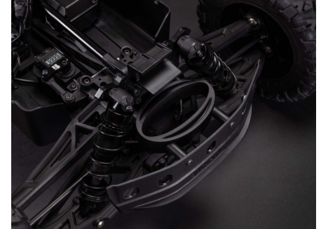 The ARRMA C-ARA7612T2 1/7 scale electric RC car features independent suspension with adjustable, oil-filled shocks mounted on black-anodized aluminium shock towers. These dampers absorb terrain impacts and maintain tyre contact for consistent grip. The coil-over springs and aluminium shock bodies provide both visual appeal and functional resilience. Suspension geometry is tuned for stability and responsiveness, allowing the truck to handle jumps, bumps, and uneven terrain with confidence. Combined with the wide stance and long wheelbase, the suspension system supports aggressive driving and smooth landings, making the ARRMA C-ARA7612T2 brushless monster truck a true bash-ready performer.