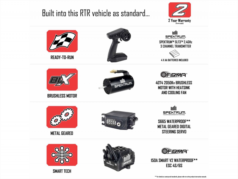- ESC: Spektrum Firma 150A Smart V2 waterproof ESC – supports 6S LiPo power and includes Smart telemetry compatibility