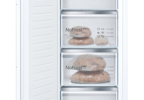 Yes – this model features a sophisticated frost free built-in freezer white design, thanks to Bosch's advanced Full NoFrost technology. Unlike conventional models that suffer from icy residue build-up, this freezer automatically circulates air and extracts humidity, preventing frost accumulation. That means no more messy manual defrosting – and more usable space for food storage. Your freezer stays efficient and hassle-free throughout the year.
