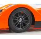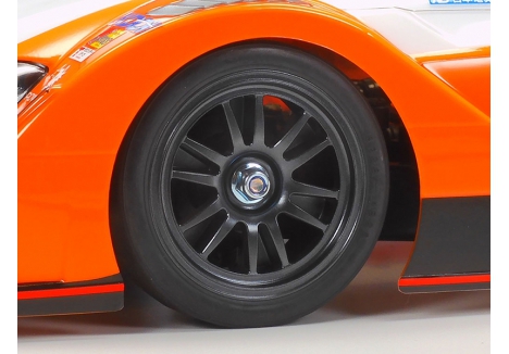 The Tamiya TT-02 chassis RC car with gunmetal wheels TAM58703 combines aesthetic appeal with mechanical sophistication. The gunmetal 12-spoke wheels are not only visually striking but also paired with racing slicks for optimal traction. Brake disc-shaped wheel hubs and stylish bumper supports add to the realism, while resin ball links in the steering linkage ensure smooth and precise control. These features make the model a top choice for Super GT replica builds and competitive R/C racing.