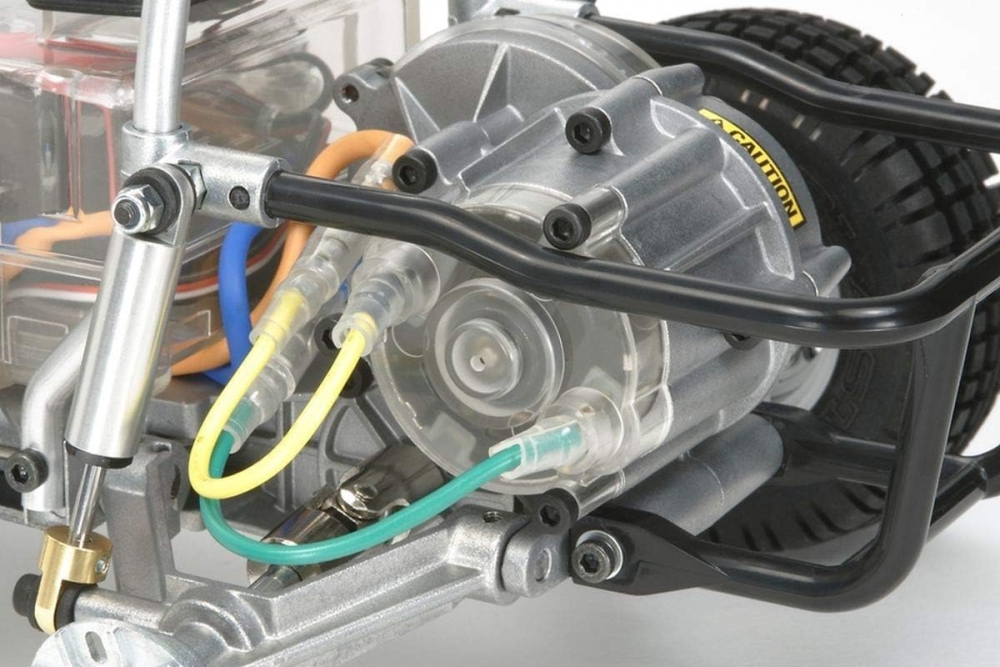 The Tamiya 1/10 Buggy Champ Re-release is designed for hobbyists who value classic RC engineering. Its layout mirrors the original Rough Rider, with modern upgrades like full ball bearings and a reinforced FRP chassis. The transparent mechanism box adds a retro touch while offering practical protection, and the die-cast suspension arms retain the authentic look and feel of 1970s off-road kits. With grooved front tyres and block-pattern rears, this buggy is built for both display and action.