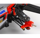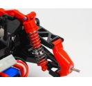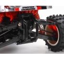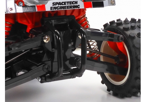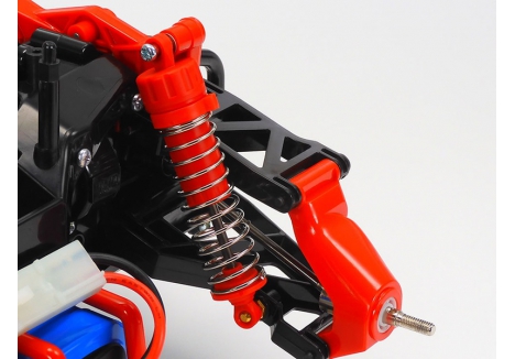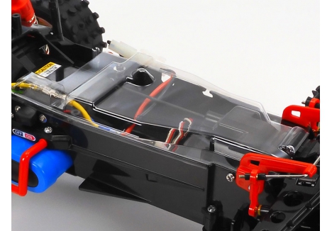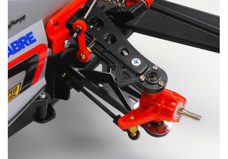 The Tamiya Super Sabre 4WD chassis with CVA oil dampers is built for off-road dominance. Its shaft-driven 4WD system ensures consistent power distribution across all wheels, while the midship motor placement enhances balance and stability. The sealed front and rear gearboxes house bevel differential gears that enable smooth cornering, even on loose surfaces. The double wishbone suspension is supported by short CVA oil dampers II and a front stabilizer, which work together to absorb shocks and reduce body roll. Whether navigating dirt tracks or rocky trails, this chassis delivers responsive handling and reliable traction.