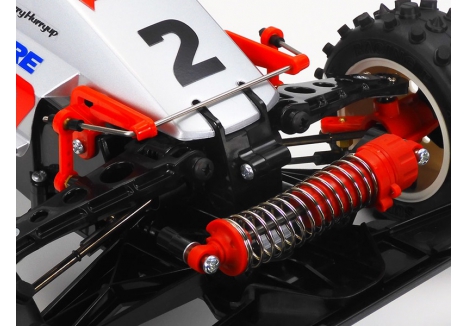 The Tamiya Super Sabre TAM58728 1/10 R/C buggy revives a beloved 1980s model with modern refinements that enhance both performance and durability. The pre-painted silver body is crafted from 0.7mm thick polycarbonate and comes pre-cut for convenience. A separate wing part adds aerodynamic flair, while the red suspension uprights inject a splash of visual energy. This re-release is more than a cosmetic update—it’s a fully capable off-road machine designed to meet the expectations of today’s RC enthusiasts.