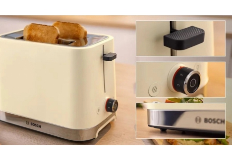 Absolutely. The Bosch toaster with automatic centring and high lift feature is designed for safe and easy use. Automatic centring aligns each slice perfectly within the slot, guaranteeing uniform toasting. The high lift mechanism raises smaller items above the slot edge, allowing users to retrieve them without reaching into the hot toaster. Combined with the auto-off function, which shuts down the appliance if bread becomes stuck, this model offers peace of mind with every use.