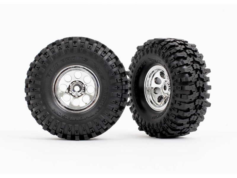 Designed for the TRX-4M Long Arm Lift Kit, Mickey Thompson Baja Pro XS 2.4x1.0" tyres are taller than standard TRX-4M tyres for more ground clearance and an aggressive stance. tyres come pre-mounted to 1" chrome 8-hole mag wheels. For extra control on the trail, try 9874 firm or 9875 soft foam inserts. Long Arm Lift Kit recommended to prevent rubbing.