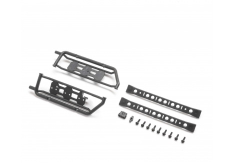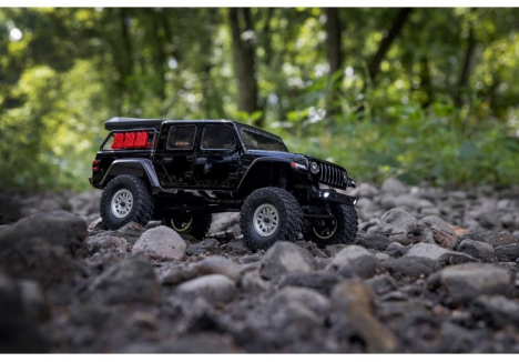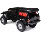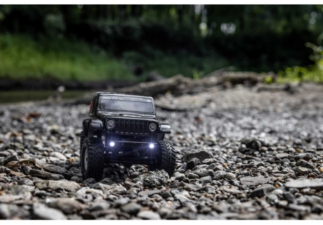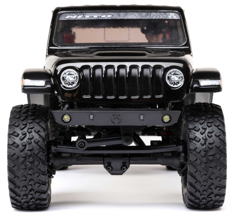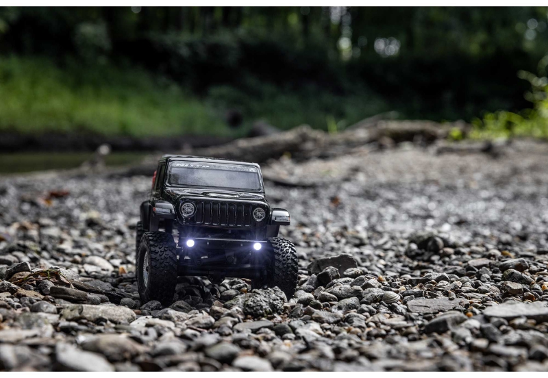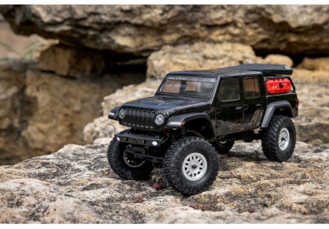The Axial SCX24 black Gladiator with polycarbonate body and LED bumper lights C-AXI00005V2T5 captures the rugged styling of the full-size Jeep JT Gladiator in miniature form. Its factory-finished polycarbonate body features molded details and a tilt-back design for easy battery access. Two LED lights integrated into the front bumper illuminate the trail ahead, enhancing both functionality and visual appeal. This combination of realistic bodywork and lighting makes the Gladiator a standout in the world of micro crawlers.