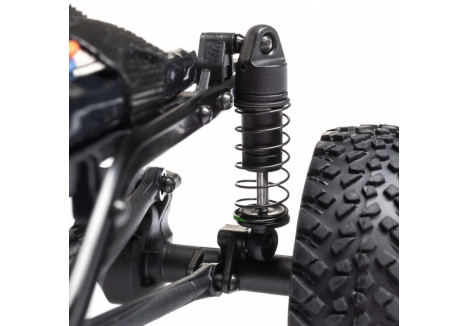 The Axial 1/24 black Jeep Gladiator with oil-filled shocks and steel chassis rails is engineered for smooth suspension response and structural durability. The oil-filled shocks absorb bumps and terrain changes with precision, while preload spacers allow for fine-tuning. Steel C-channel chassis rails provide a rigid backbone that resists flex and maintains alignment during demanding climbs. Together, these features ensure that the Gladiator remains stable and responsive across varied terrain.