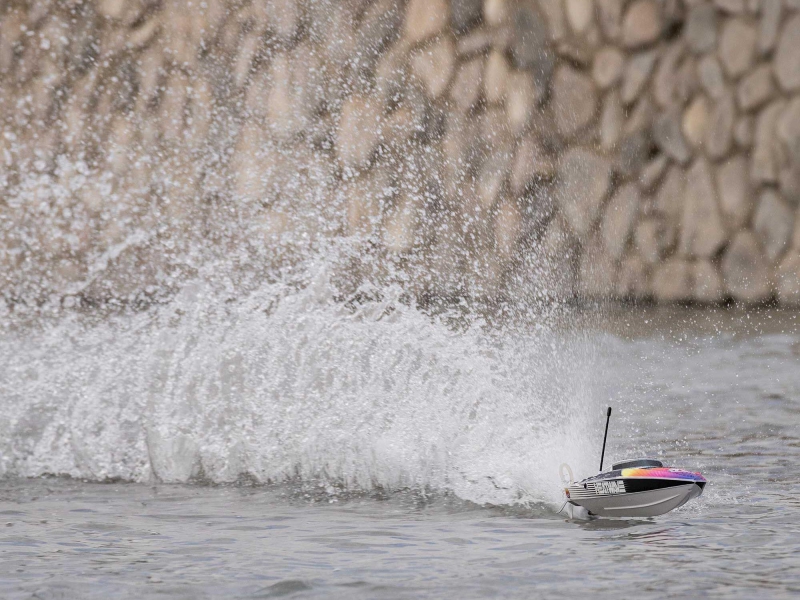 The self-righting hull on the Pro Boat B-PRB08053T2 Heatwave livery RC boat with self-righting hull and composite stand is a standout feature for both beginners and experienced users. If the boat flips during operation, a long press on the SLT3 transmitter instantly activates the self-righting mechanism, flipping the boat upright and allowing you to resume control. This eliminates the need for manual retrieval and ensures uninterrupted fun, especially in remote or deep water environments. The deep-V hull design also contributes to stable tracking and smooth handling, even at high speeds.