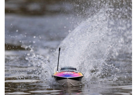 The Pro Boat B-PRB08053T2 mini deep-V boat with SLT3 transmitter and Smart battery features a Spektrum Firma 2931 2950Kv brushless motor and a 30A marine ESC, both equipped with water-cooled heatsinks. This system helps regulate internal temperatures, preventing overheating and extending the lifespan of the electronics. The brushless motor’s 8-pole design delivers smooth acceleration and high torque, while the ESC supports 2S and 3S LiPo batteries for flexible power options. Together, they enable the boat to reach speeds over 25 MPH with consistent performance throughout each run.