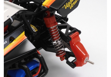 The Tamiya Hotshot II TAM58737 4WD buggy features a shaft-driven 4WD system with sealed front and rear gearboxes, each housing a differential for smooth cornering. This configuration ensures reliable power delivery and protection against debris, making it suitable for dirt tracks, gravel paths, and rough terrain. The underguard shields the underside of the chassis, while the front stabiliser and CVA oil dampers work together to maintain balance and control during aggressive driving.