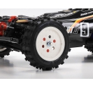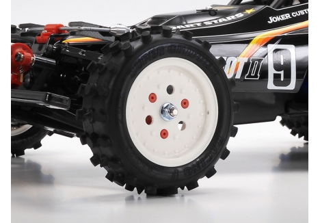 The Tamiya Hotshot II (2024) R/C buggy TAM58737 comes equipped with white dish wheels of varying widths front and rear. Each wheel is paired with semi-pneumatic oval block tyres designed for off-road grip and shock absorption. The front tyres measure 31mm in width and 88mm in diameter, while the rear tyres are 38mm wide with the same diameter, offering a balanced footprint for traction and stability.
