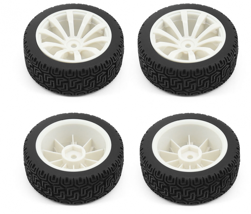 Finish the look of your Scale Rally body with these great looking wheel and tyre sets. Mounted Rally Tread tyres with foam inserts on a stylish 10 Spoke White Wheel.