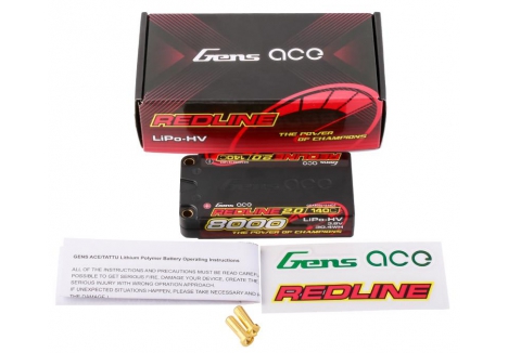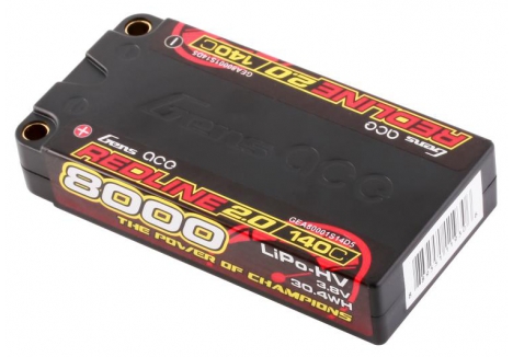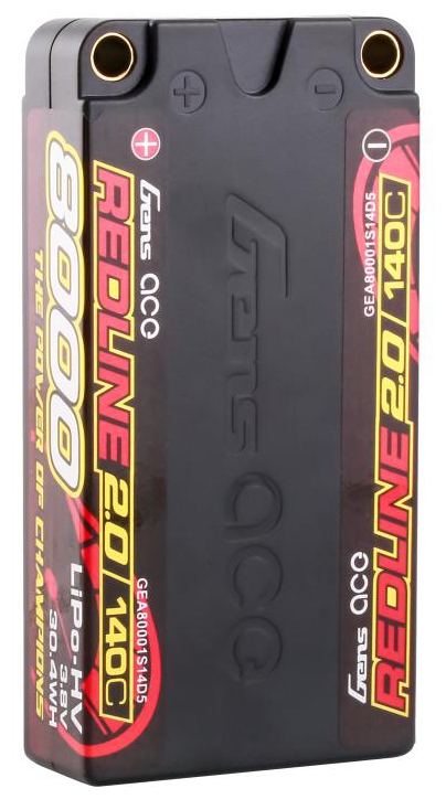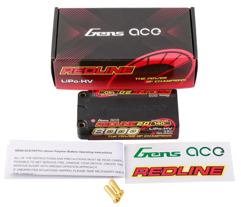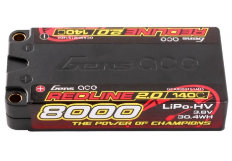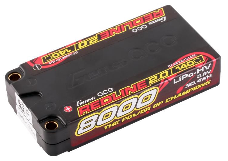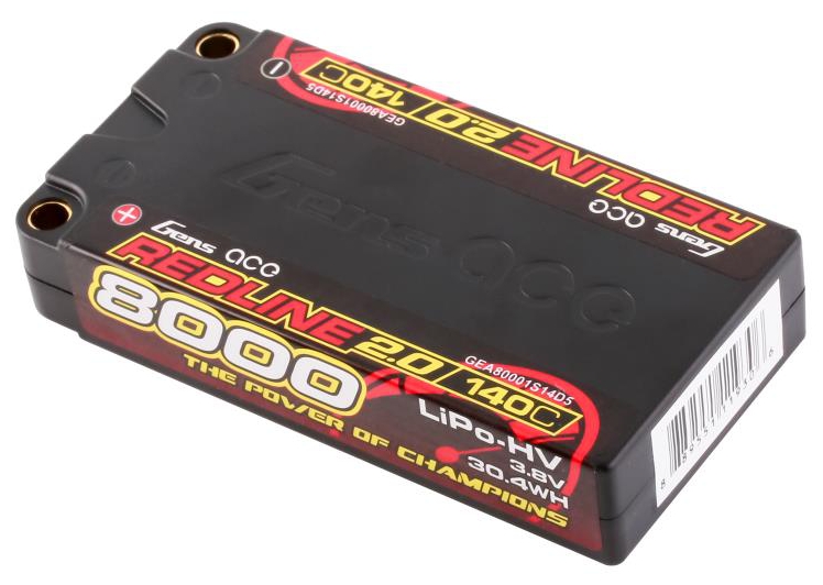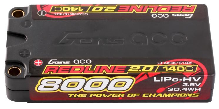 Gens Ace Redline 2.0 Series 1S 140C 8000mAh Hardcase LiPo Battery Pack, with a factory installed 5.0mm bullet. Consumers trust the Gens Ace name to deliver the dependability and high performance they expect. The Gens Ace 140C 1S 8000mAh 3.8V HV LiPo battery pack has a high-capacity, high-discharge rate that gives you the power and run-time you expect .