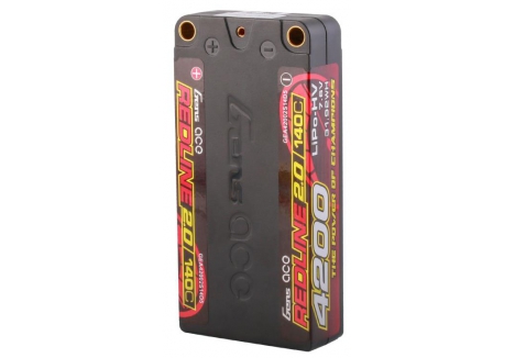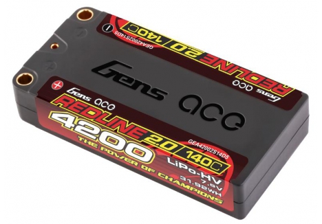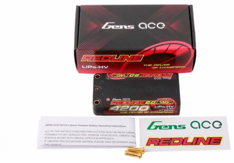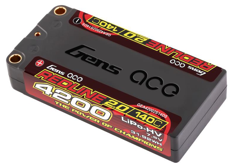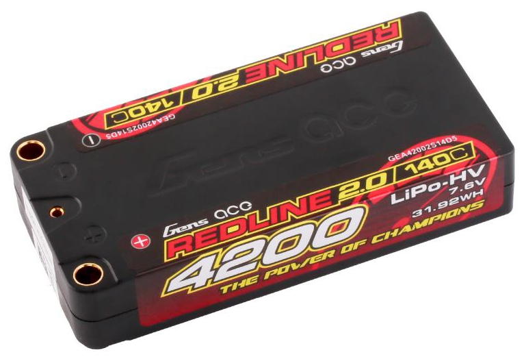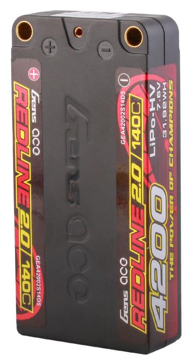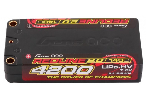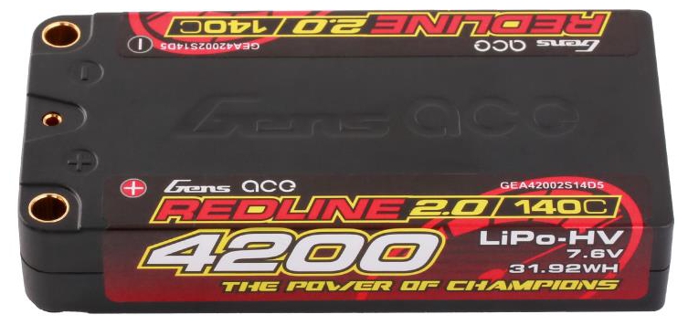 Gens Ace Redline 2.0 Series 2S 140C 4200mAh Hardcase LiPo Battery Pack, with a factory installed 5.0mm bullet. Consumers trust the Gens Ace name to deliver the dependability and high performance they expect. The Gens Ace 140C 2S 4200mAh 7.6V HV LiPo battery pack has a high-capacity, high-discharge rate that gives you the power and run-time you expect .