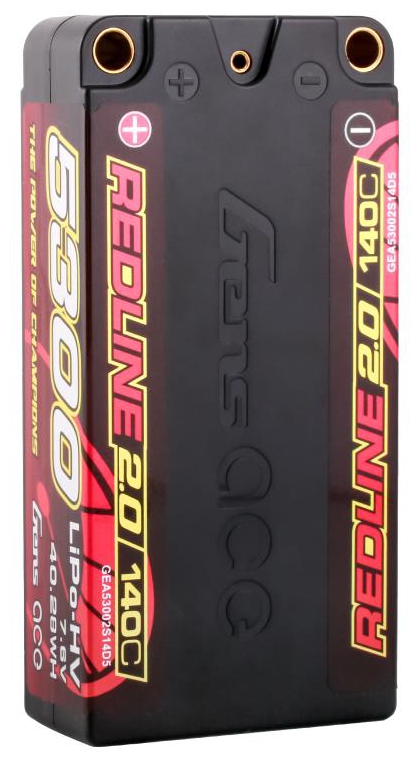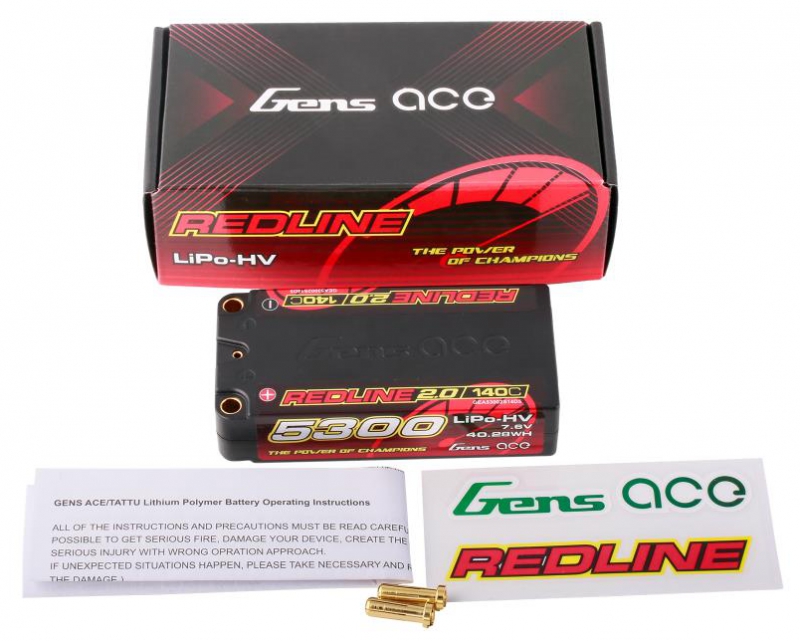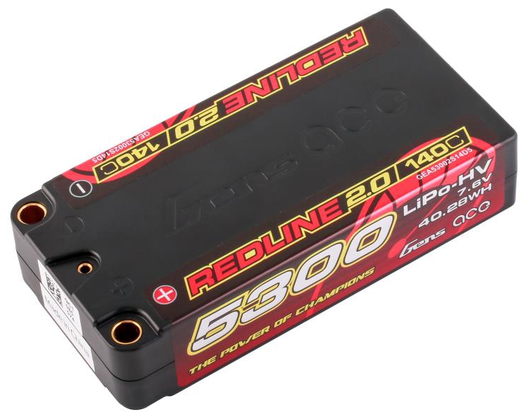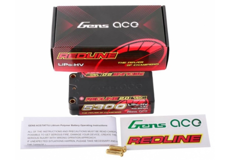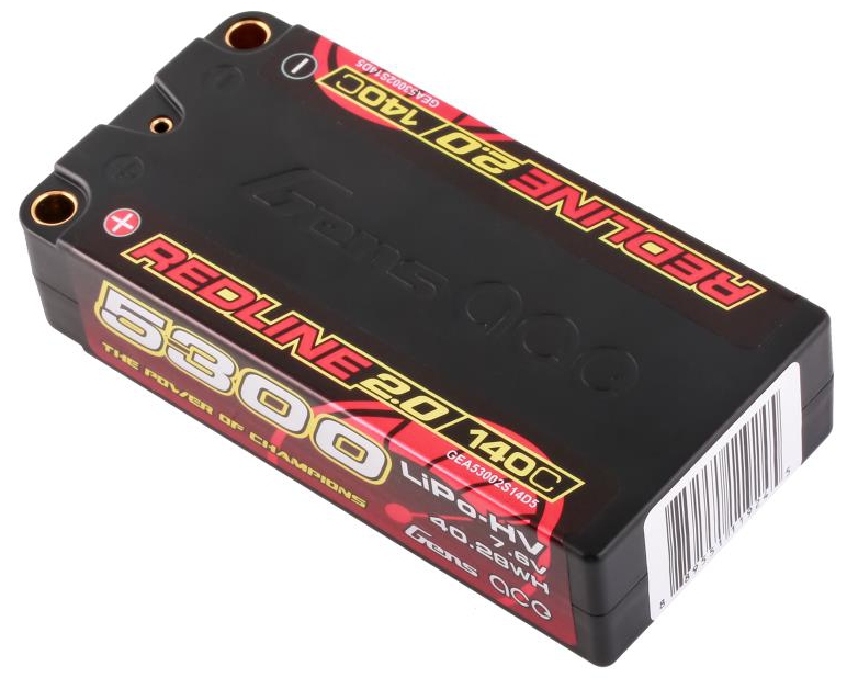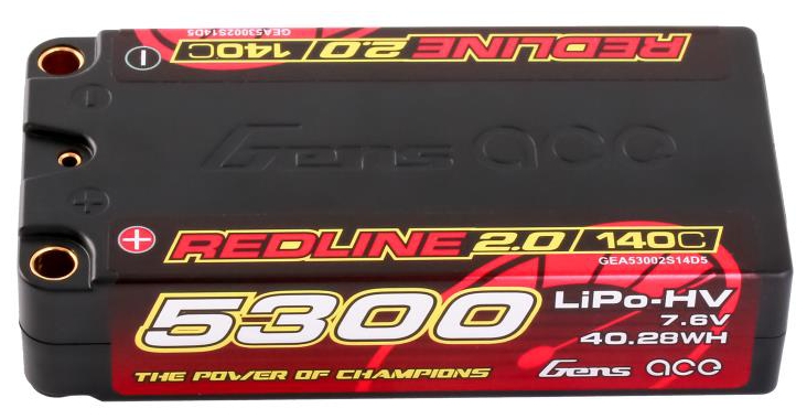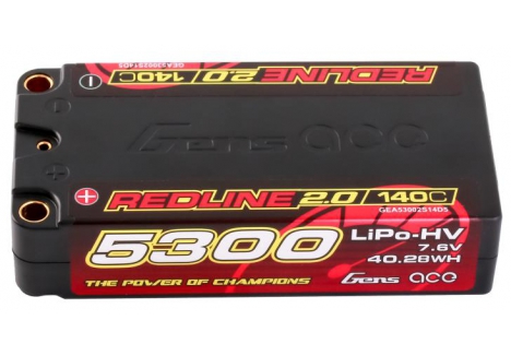 Gens Ace Redline 2.0 Series 2S 140C 5300mAh Hardcase LiPo Battery Pack, with a factory installed 5.0mm bullet. Consumers trust the Gens Ace name to deliver the dependability and high performance they expect. The Gens Ace 140C 2S 5000mAh 7.4V HV LiPo battery pack has a high-capacity, high-discharge rate that gives you the power and run-time you expect .