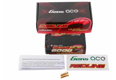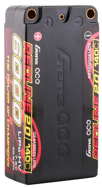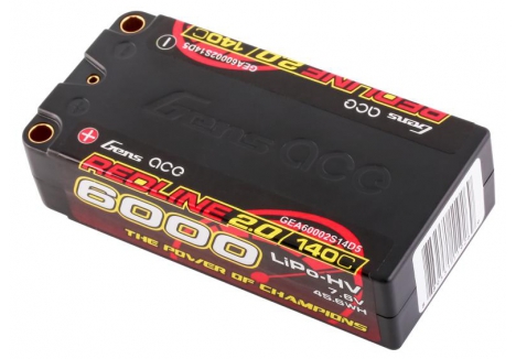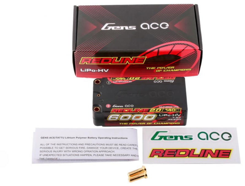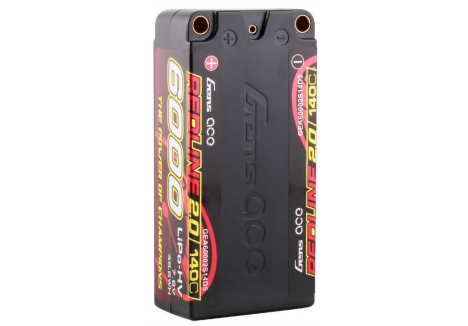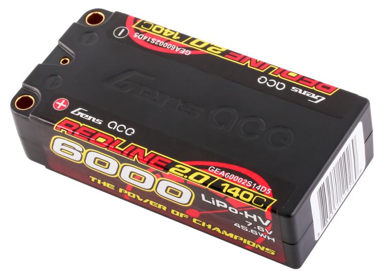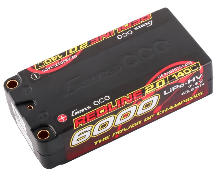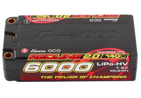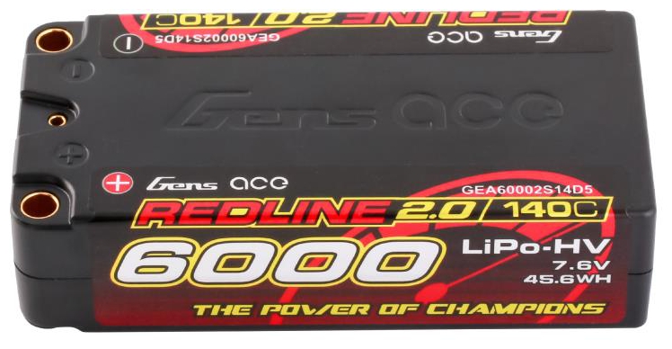 Gens Ace Redline 2.0 Series 2S 140C 6000mAh Hardcase LiPo Battery Pack, with a factory installed 5.0mm bullet. Consumers trust the Gens Ace name to deliver the dependability and high performance they expect. The Gens Ace 140C 2S 6000mAh 7.6V HV LiPo battery pack has a high-capacity, high-discharge rate that gives you the power and run-time you expect .