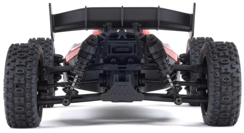 The ARRMA TYPHON GROM red with oil-filled shocks and Smart LiPo charger is built for rugged environments. Its oil-filled coil-over shocks absorb bumps and maintain stability across uneven surfaces, while the independent suspension system ensures smooth handling. The tough buggy wheels and tires provide excellent traction, and the waterproof electronics—including the Spektrum SX110 metal-geared servo and SLT 2-in-1 ESC/receiver—allow for worry-free operation in wet conditions. These features make the buggy a dependable performer in all weather and terrain types.