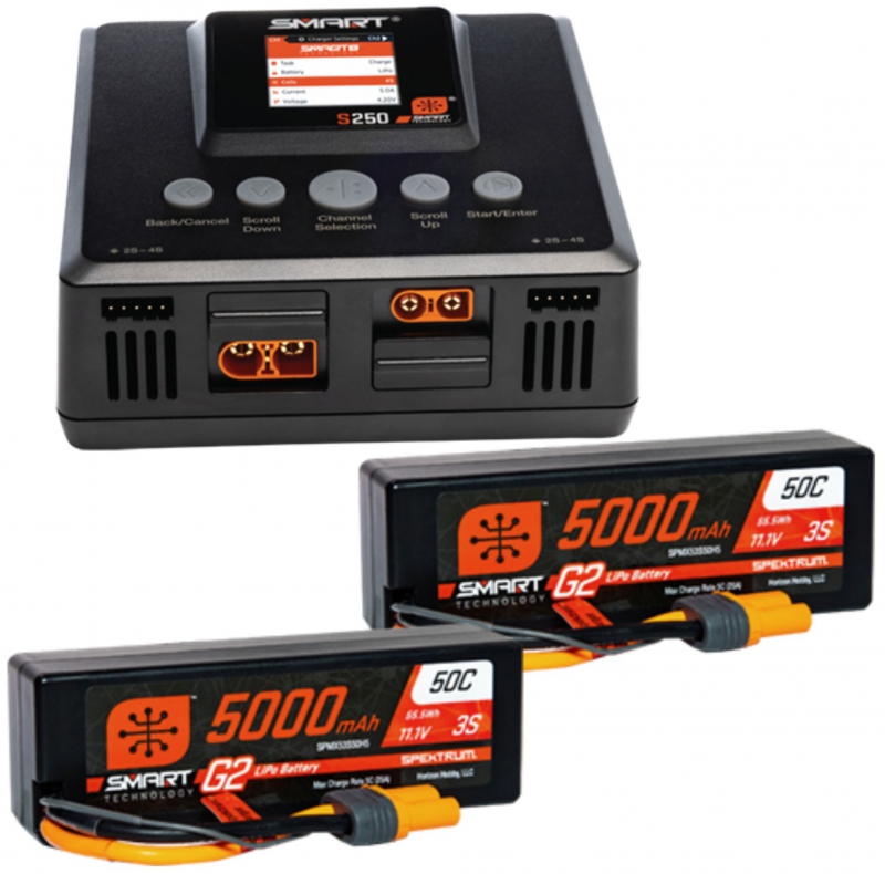 - Product Type: Spektrum O-SPMXPSS600I Powerstage bundle with dual 5000mAh 3S 50C Smart G2 LiPos and S250 charger, Spektrum O-SPMXPSS600I Smart surface bundle with IC5 batteries and 2x50W dual-port charger, Spektrum O-SPMXPSS600I 6S-capable Smart G2 LiPo + S250 charger for 1/8 and 1/10 RC vehicles, Spektrum O-SPMXPSS600I with auto storage discharge and one-wire balance charging, Smart G2 bundle with 50C discharge LiPos and color LCD charger interface, Spektrum surface battery and charger combo with IC5 connectors and 5C charge rate