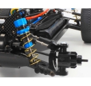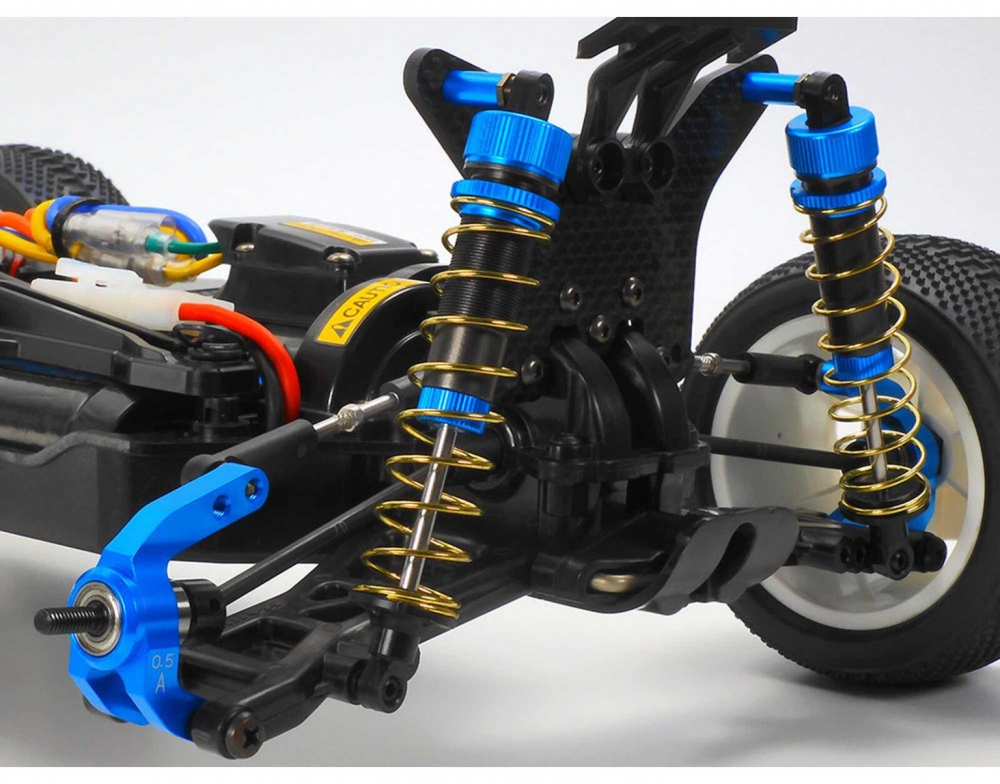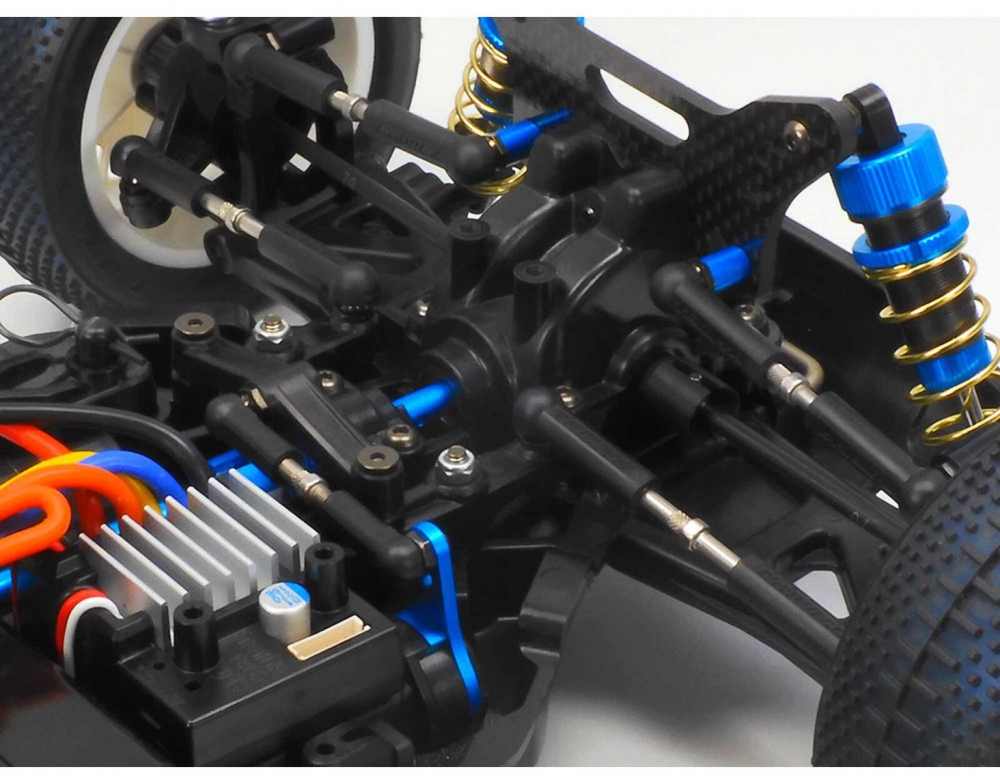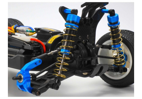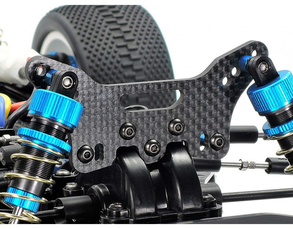 The Tamiya carbon damper stay RC buggy configuration includes 3mm thick front and rear mounts that support multiple damper positions and upper arm setups. This allows racers to adjust suspension geometry for different track conditions, improving grip and stability. The longer turnbuckle shafts prevent plastic adjusters from flexing, ensuring consistent alignment and suspension movement. Combined with aluminum oil dampers, the TT-02BR delivers responsive handling and shock absorption across varied terrain.