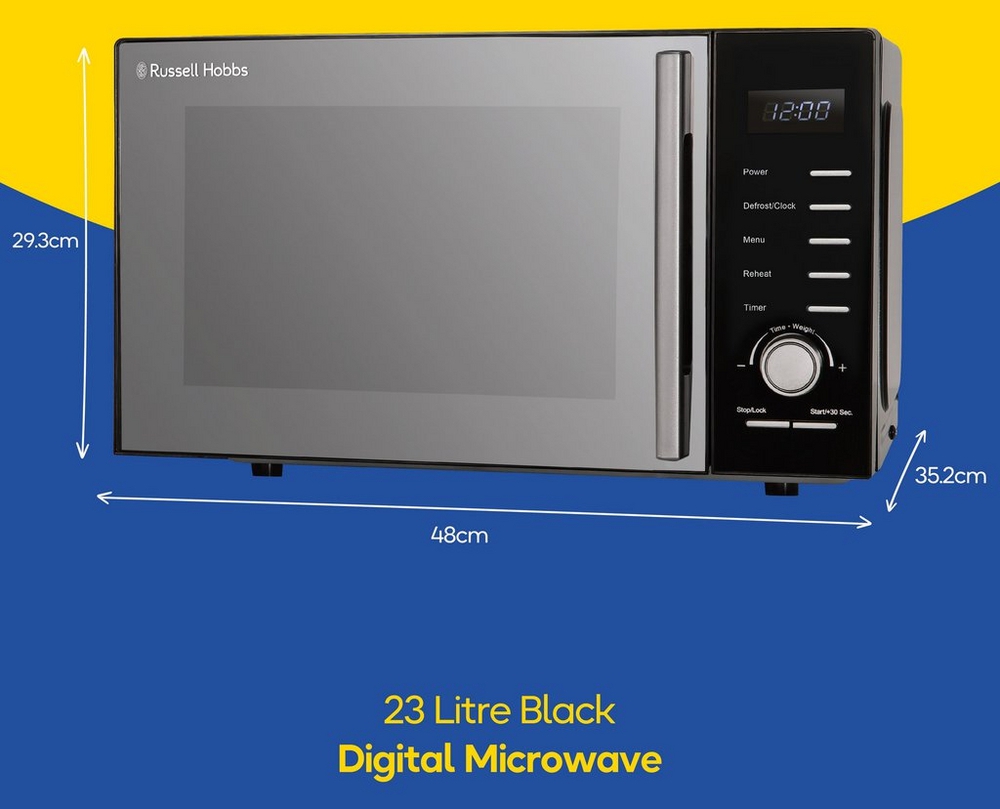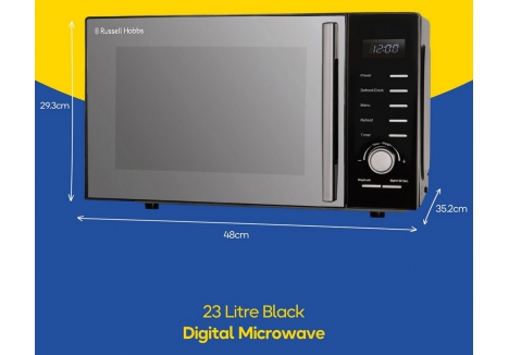 - Product Type: Russell Hobbs RHM2348B solo microwave black, Russell Hobbs RHM2348B 23L digital microwave, Russell Hobbs RHM2348B microwave with turntable, Russell Hobbs RHM2348B with 800W power and LED light, Russell Hobbs microwave with stainless steel cavity and child lock