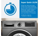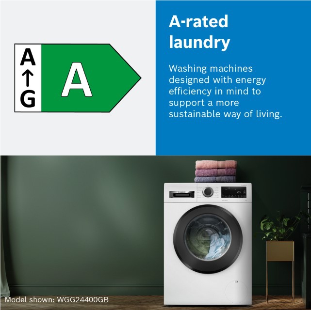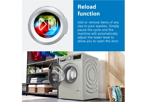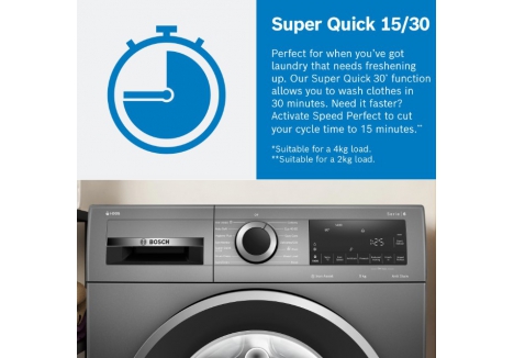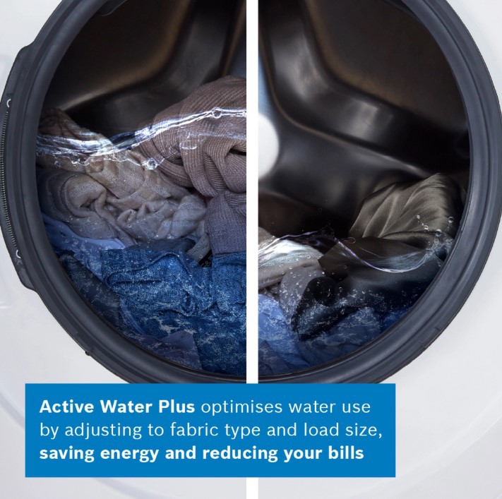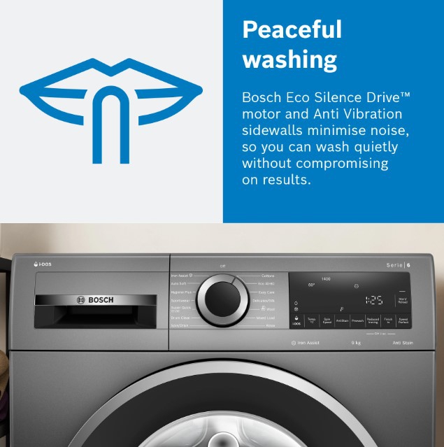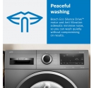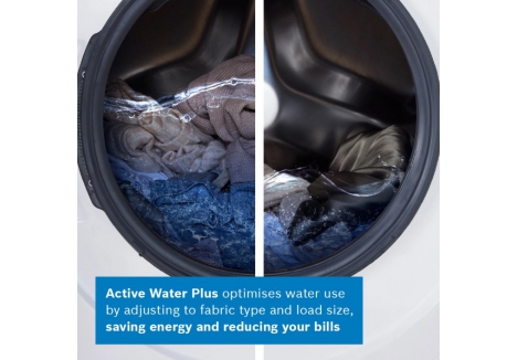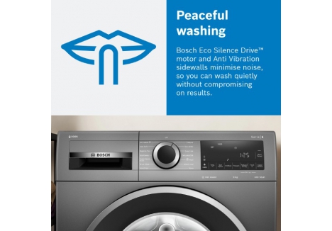 This model is fitted with Bosch’s renowned EcoSilence Drive™ motor. Built without brushes, this drive system ensures ultra-quiet operation and long-lasting performance with reduced vibration. It’s perfect for open-plan living spaces or late-night cycles, where noise control is essential. The quiet graphite washer with eco and speed wash technology enables focused cleaning while consuming minimal power and maintaining fabric care standards.